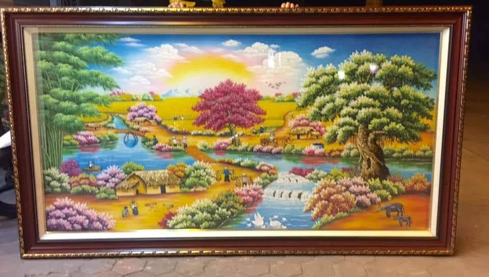 - Những mẫu tranh phong cảnh thiên nhiên ở làng quê được đặc biệt ưa chuộng để trang trí. Bởi tranh mang lại sự thân thiện, gần gũi đơn sơ với mái nhà tranh, cây đa giếng nước đầu đình. Với những ruộng lúa thẳng cánh cò bay. Hay những ao sen rực rỡ ánh hồng. Và bạn sẽ không còn muốn đi đâu ngoài căn nhà của mình bởi từ đây bạn có thể thấy được cả một Việt Nam thu nhỏ đẹp đẽ.