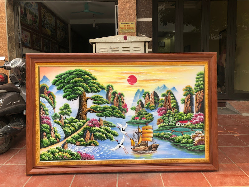 kích thước bức tranh 136*226cm giá 7.5 triệu bao gồm cả khung. giá tranh sẽ thay đổi theo độ cầu kỳ và giá trị nguyên liệu bỏ vào tranh.ngoài ra mẫu này còn có các cỡ to nhỏ khác nhau như trên bảng giá.