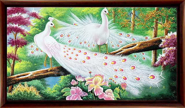 Tranh đá quý đôi công uyên ương đại diện cho hạnh phúc trọn vẹn, tình yêu bền vững.Vốn từ lâu, đôi chim uyên ương là biển tượng cho tình yêu trường tồn và hạnh phúc. Với đặc tính sống chung thủy, chim uyên ương đi vào trong các tác phẩm nghệ thuật như một lời chúc phúc cho đôi lứa mãi bền lâu. Tranh đá quý đôi chim uyên ương sẽ mang lại sự ấm áp, gia đình hạnh phúc, tình yêu đôi lứa mãi mãi bền lâu.. Tranh đá quý đôi công uyên ương rất thích hợp treo ở những không gian yên tĩnh như phòng ngủ, tranh còn có thể làm quà tặng vô cùng ý nghĩa.